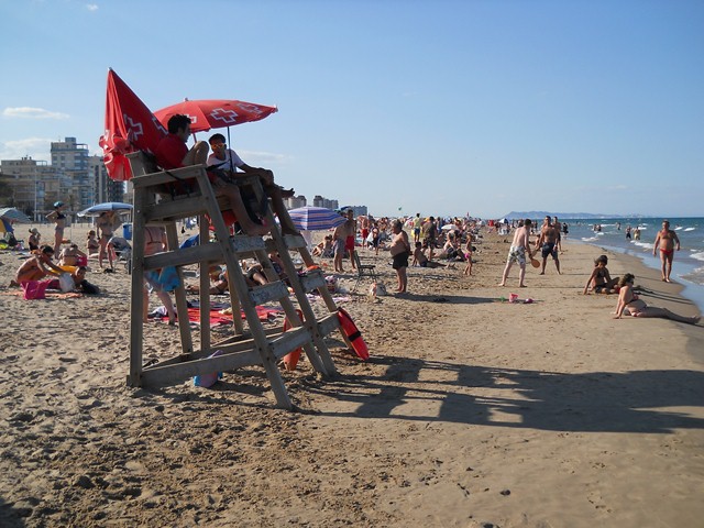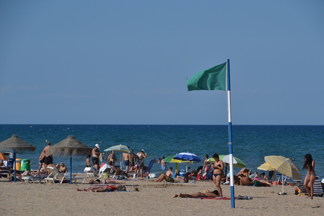 Gandia playa (beach). This is some 4 x kilometres from the centre of Gandia town (which is reached easily by either car or bus from the beach). Gandia beach is renowned for its international award winning Blue Flag rating and is a lively area with countless bars, restaurants and nightclubs. Gandia playa is immaculate, sandy and safe with a superb system of lifeguards and warning flags. The beach has a long, shallow incline that allows for safe swimming for children and adults alike. It is also cleaned daily during the summer season and is accordingly absolutely spotless and astonishingly free of rubbish. There are a profusion of showers and play areas and the new, grassed promenade is a source of justifiable pride to the Beach authorities.